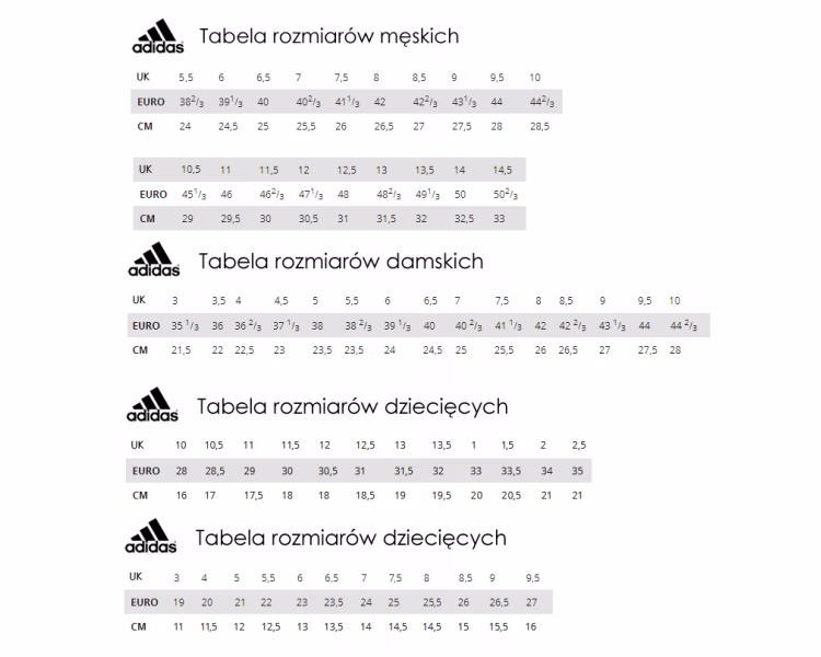Adidas ma swoje własne tabele rozmiarów oparte na długości wkładki. Chociaż są one dość spójne w obrębie marki, zawsze najlepiej sprawdzić tabelę dla konkretnego modelu, ponieważ mogą wystąpić niewielkie różnice. Rozmiarówka może się też różnić od innych marek.