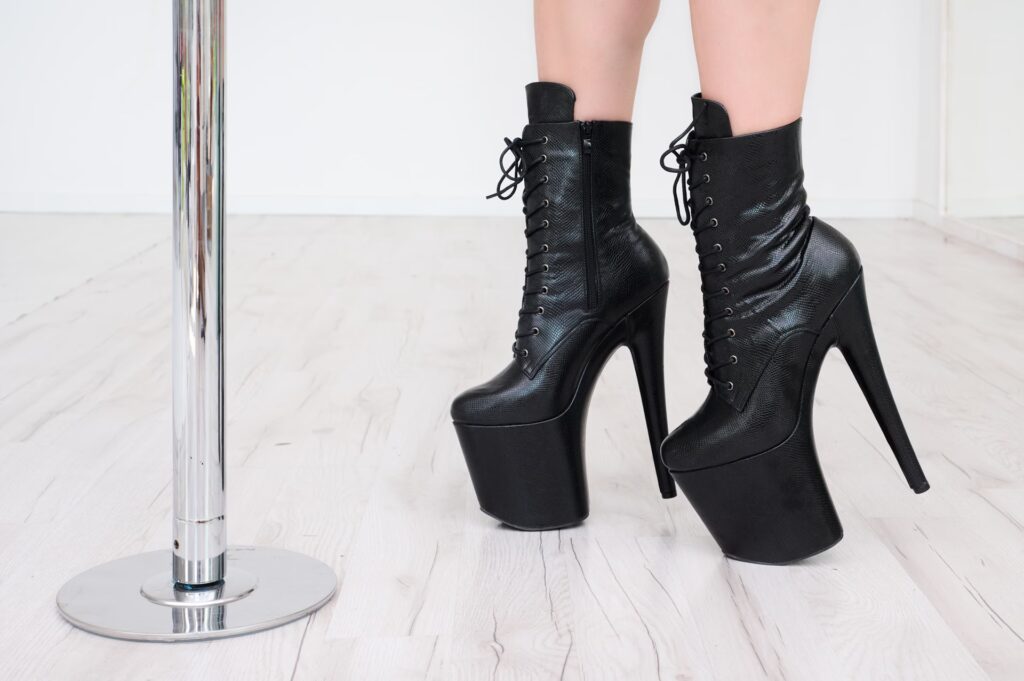 5. Styl buta: Buty do pole dance występują w różnych formach – od klasycznych sandałków na platformie, przez buty z zakrytymi palcami, po botki i kozaki sięgające za kostkę lub kolano. Sandałki są najbardziej popularne i wszechstronne. Botki i kozaki mogą oferować lepsze wsparcie dla kostki i golenia podczas niektórych figur, a także stanowią element stylizacji.