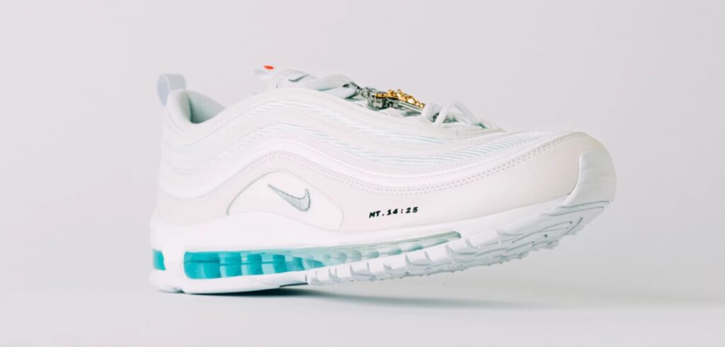 Chodzi o projekt artystyczny kolektywu MSCHF, który zmodyfikował buty Nike Air Max 97, umieszczając w ich podeszwie prawdziwą wodę święconą pochodzącą rzekomo z rzeki Jordan i poświęconą. Był to komentarz do kultury konsumpcji i symbolika nawiązująca do historii Jezusa chodzącego po wodzie.