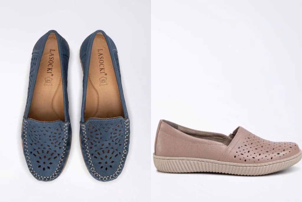 - Baleriny: Wiele modeli balerin wykonanych jest z miękkich, elastycznych materiałów, które łatwo dopasowują się do kształtu stopy. Ważne jest jednak, aby wybrać model o odpowiednio szerokim nosku, który nie będzie ściskał palców. Baleriny często są dobrym wyborem na co dzień.