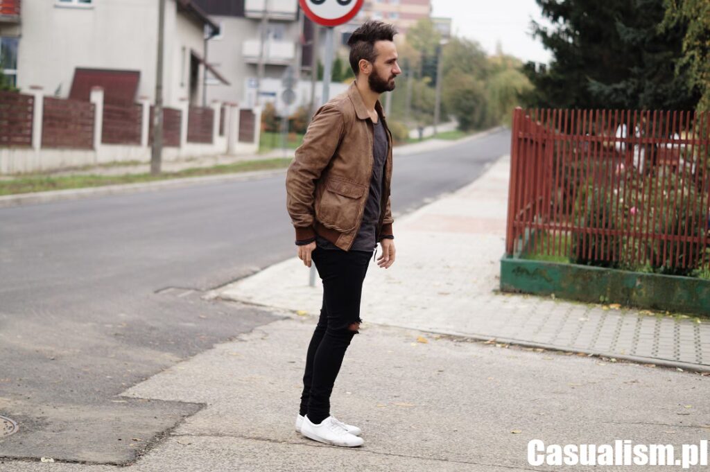 - Brąz i jeans: Brązowa kurtka (szczególnie skórzana, bomberka, parka) w połączeniu z jeansami (niebieskimi lub czarnymi) i sneakersami, botkami czy workery to kwintesencja casualowego stylu. Buty mogą być w odcieniach brązu, beżu, czerni, granatu, a nawet bieli.