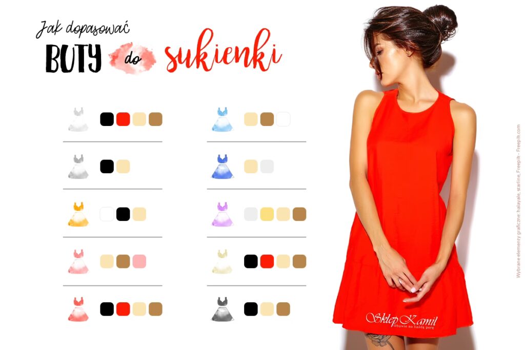 Jeśli sukienka ma bardzo intensywny, dominujący kolor we wzorze (np. duże, jaskrawo-czerwone kwiaty), unikaj butów w dokładnie tym samym, mocnym kolorze. Może to być przytłaczające. Lepszym wyborem będzie albo jeden z mniej dominujących kolorów ze wzoru, albo wspomniane neutralne odcienie.