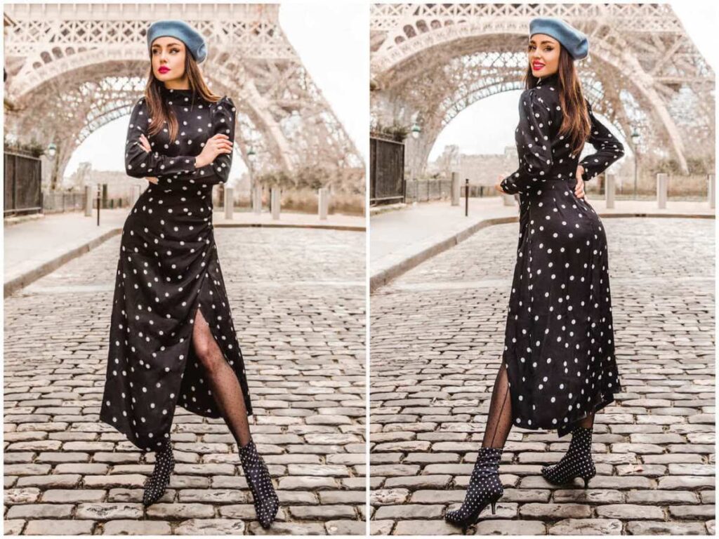 • Botki: W chłodniejsze dni botki na słupku lub płaskiej podeszwie mogą stworzyć ciekawe połączenie, zwłaszcza z sukienką midi w grochy.